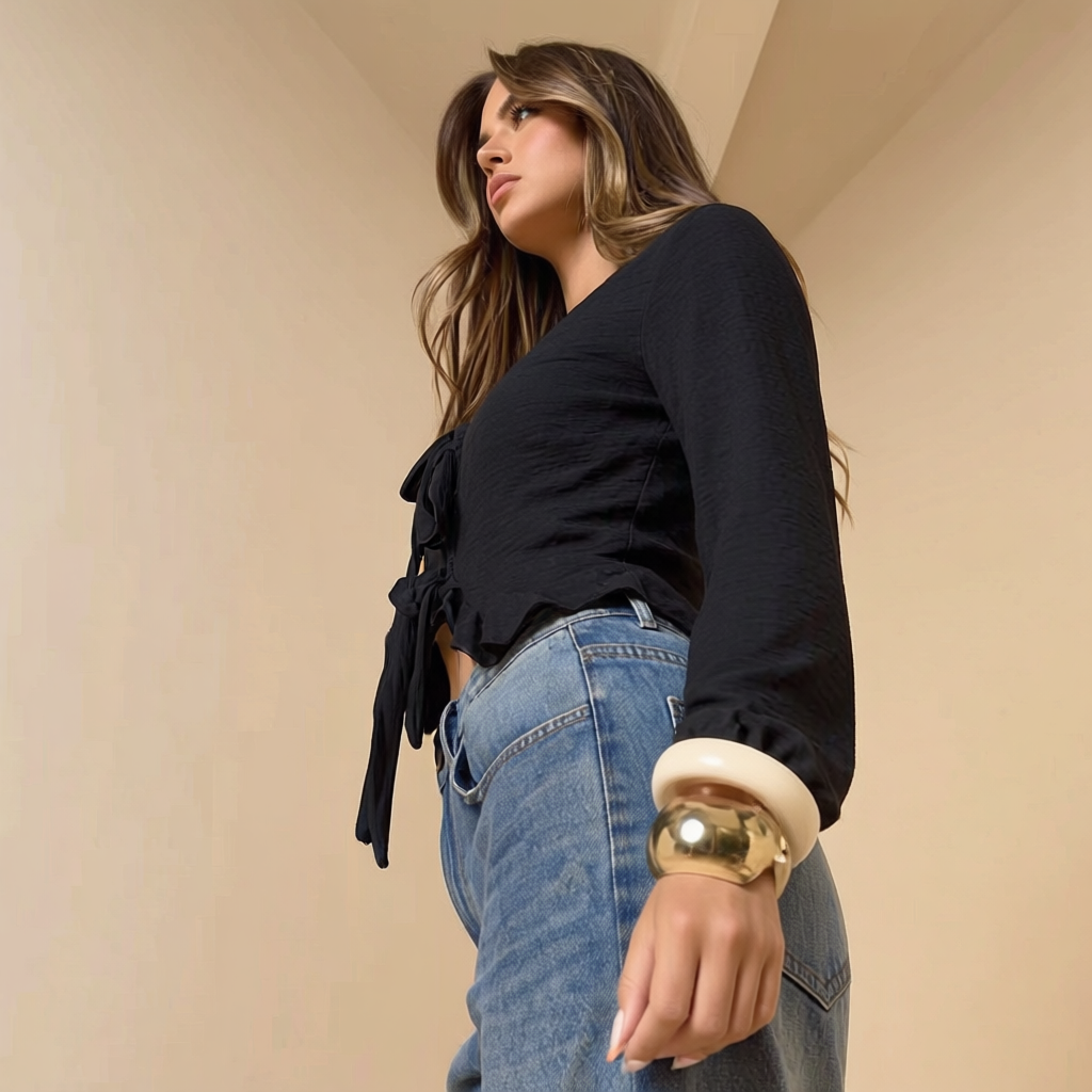Blusa manga larga en color negro con delicados lazos frontales que aportan un detalle femenino y sofisticado. Su diseño estiliza la figura y permite un ajuste sutil que realza la silueta, convirtiéndola en una prenda versátil ideal para crear looks elegantes, modernos y perfectos tanto para el día como para la noche.