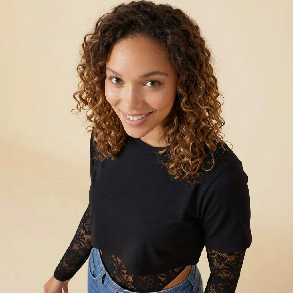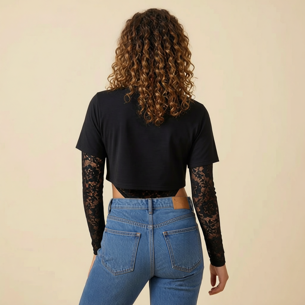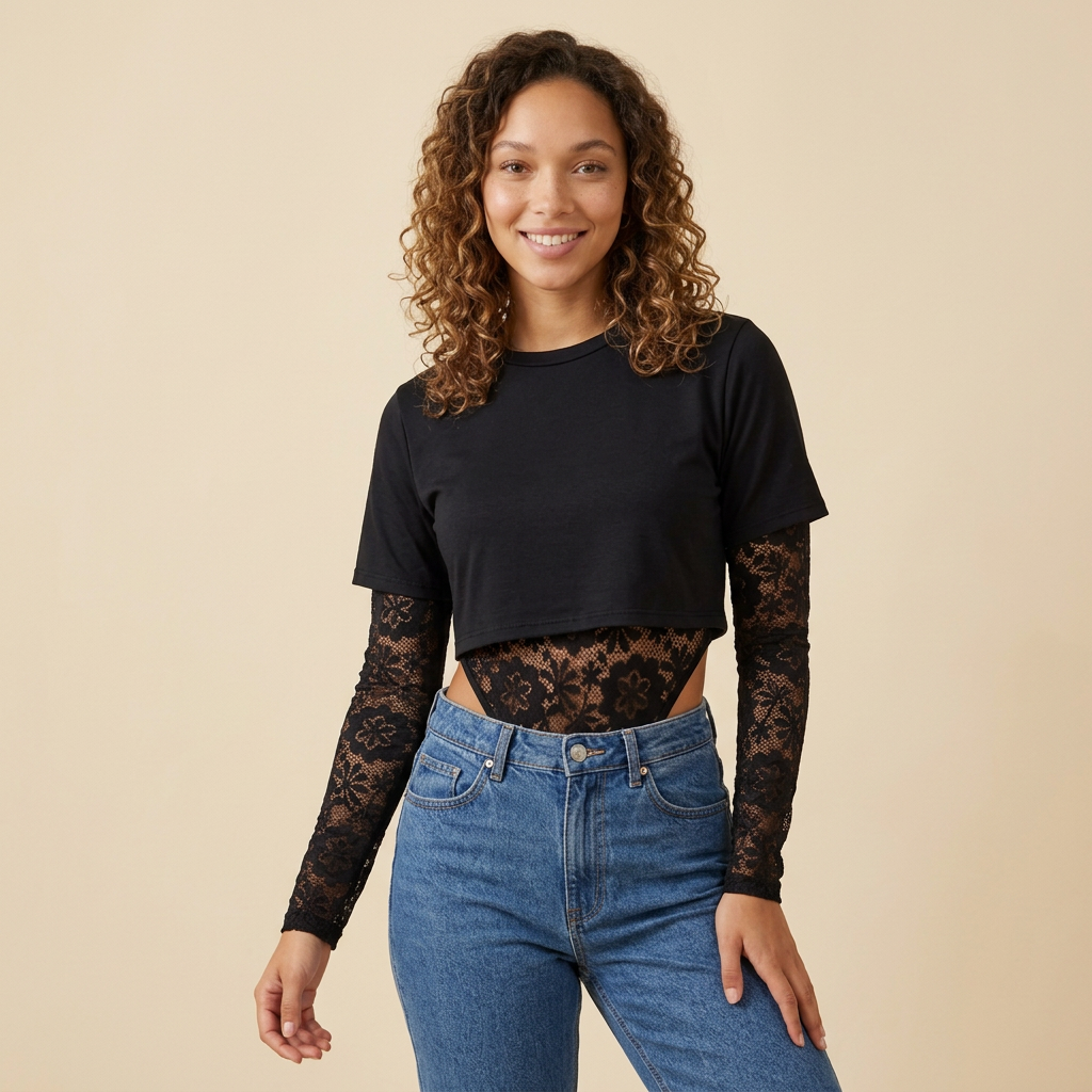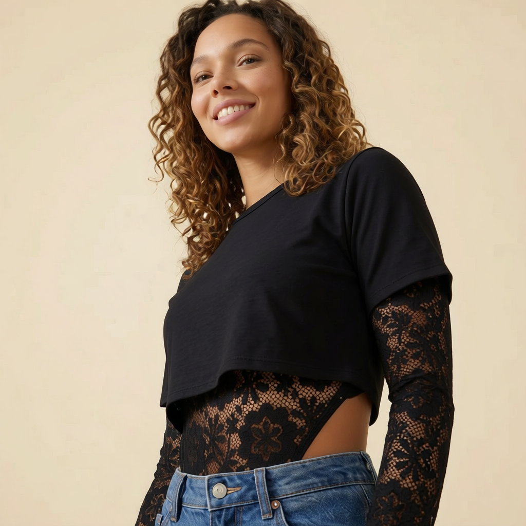 Body de malla en color negro con básica encima, creando un contraste moderno y atractivo. Una prenda versátil para looks nocturnos o urbanos con mucho estilo.