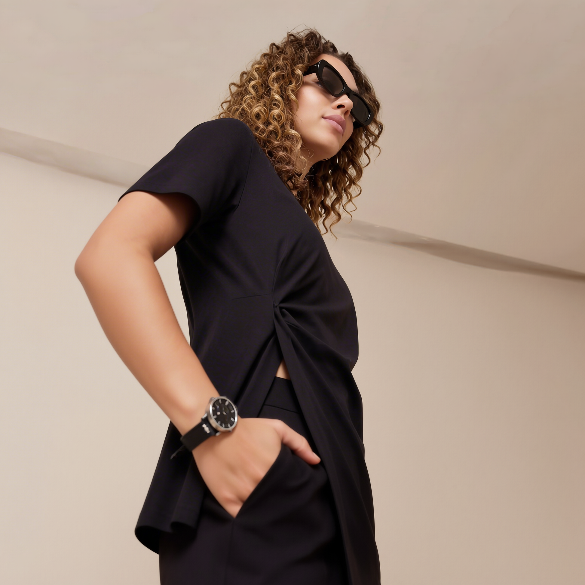 Camiseta de corte relajado en color negro con nudo lateral que redefine el básico clásico. Es una prenda cómoda, versátil y con un toque contemporáneo, perfecta para crear looks casuales con estilo y frescura.